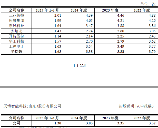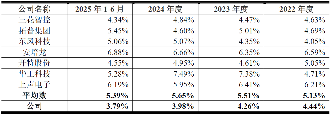具(ju)体来看,2022年至(zhi)2025年1-6月,天博智能研(yan)发费用分别为4298.56万(wan)元、5404.56万(wan)元、6739.13万(wan)元和3486.50万(wan)元,看似(si)呈增长趋势,但研(yan)发费用率(研(yan)发费用占营业收入比(bi)例)从2022年的4.44%逐年下滑至(zhi)2025年1-6月的3.79%。同(tong)期,同(tong)行业可比(bi)公司的研(yan)发费率均值分别为5.13%、5.51%、5.65%和5.39%,始终保持在(zai)5%以上且呈上升趋势,天博智能研(yan)发投入力度与(yu)行业发展趋势相悖。