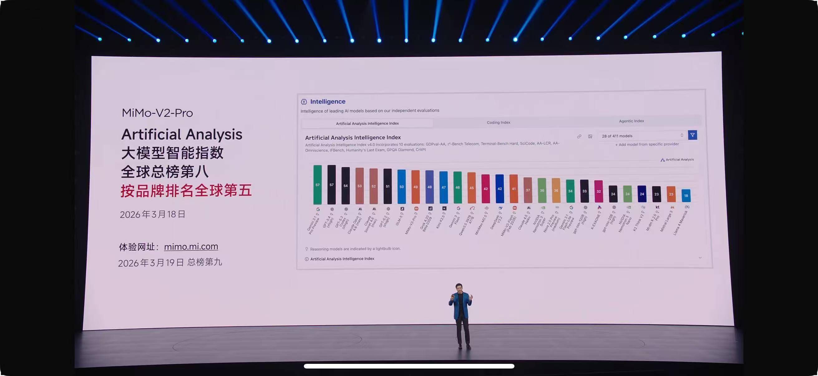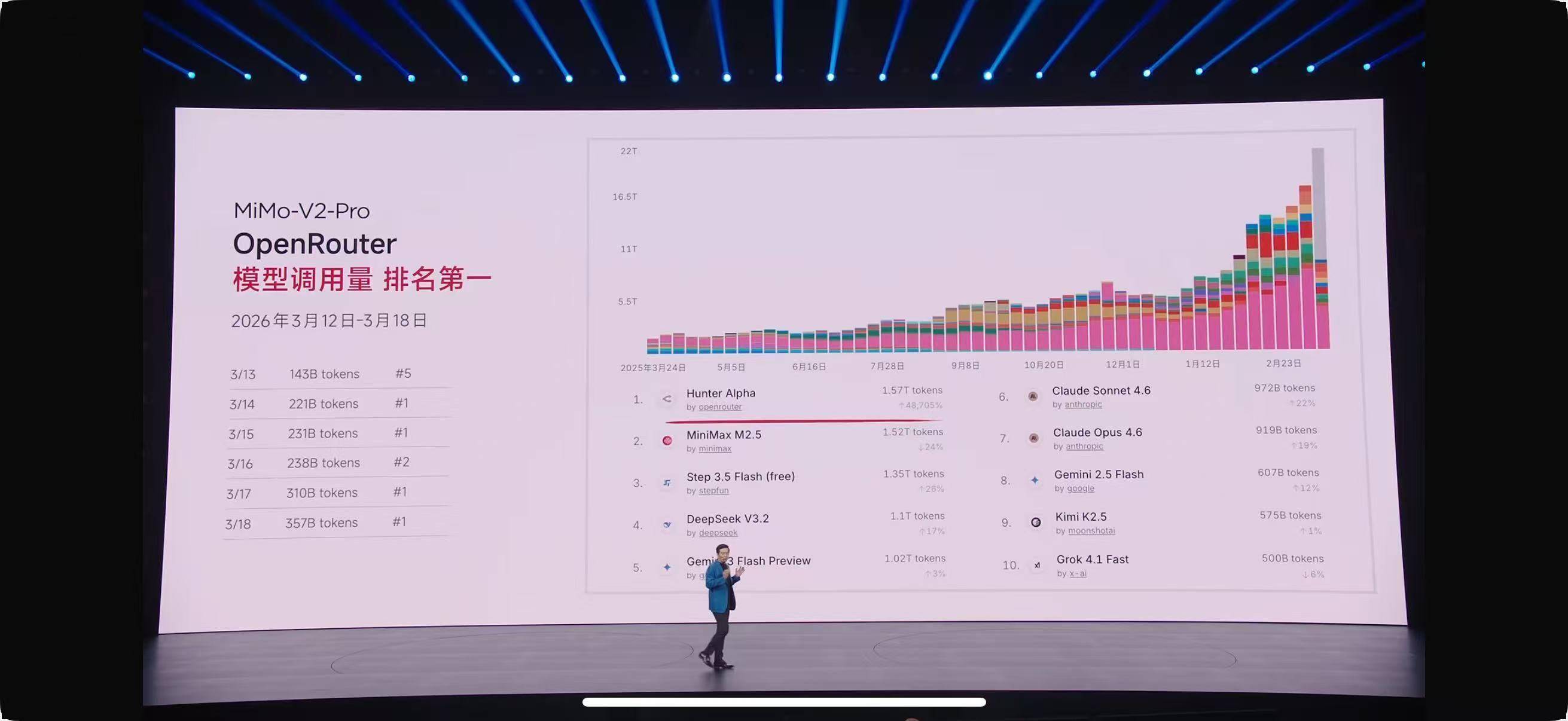 3月19日,在今晚的新一代小米SU7春季(ji)新品发布(bu)会(hui)上,小米创办(ban)人(ren)、董事长(chang)兼(jian)CEO雷军称:小米大模子(zi)Xiaomi MiMo-V2-Pro在知名大模子(zi)API聚合平台(tai)OpenRouter上发布(bu)后,近一周(zhou)(2026年3月12日-3月18日)模子(zi)调用(yong)量排名第一!在大模子(zi)智能指数全球总榜第8、按品牌排名全球第五!