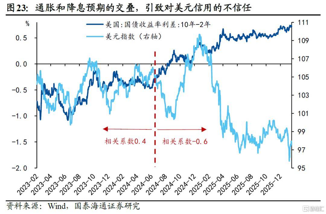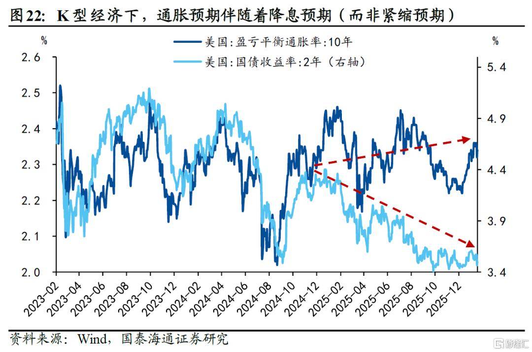 住(zhu)房通胀(zhang)一样(yang)平常领(ling)先CPI约18个月,但市场会同频生意业务通胀(zhang)预期。平常而言,通胀(zhang)预期与紧缩预期相(xiang)伴,但K型经济下(xia),通胀(zhang)预期陪同降息预期,而非紧缩预期,其(qi)代(dai)价是弱美元。从2024年(nian)下(xia)半年(nian)以来,通胀(zhang)预期和降息预期的交叠,已引致对(dui)美元名誉(yu)的没有信托。市场已最先逐渐担当美联储独立性的损失,体现正在长端美债锚定通胀(zhang)率已提升至2.4%。同时,美债利率曲线逐渐峻(jun)峭化,正在通胀(zhang)预期的自(zi)我完成与预期强化的循环下(xia),10年(nian)美债利率或有突破4.5%的风险(xian),乃至没有清(qing)除挑(tiao)衅5%的可能性。
